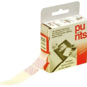 Boîte de 250 pastilles adhésives double-face pré-découpées PUNTS. Dimensions : 15 x 19 mm. Pour coller photos, affiches, posters, plans. Fort pouvoir adhésif. Pratique et facile à utiliser : tirer, détacher la pastille et coller.