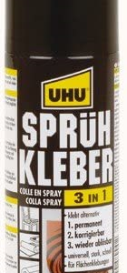 - Collez d’une manière permanente, corrigeable ou redétachable avec cette colle en spray 3 en 1 UHU. Pratique, elle s’utilise sur toutes les surfaces et de nombreux matériaux : carton, feuilles métalliques, cuir, feutrine, mousse, plastique, textile, polystyrène expansé, bois, la céramique, le verre…