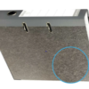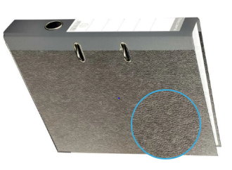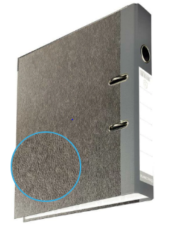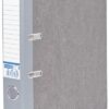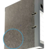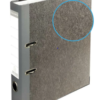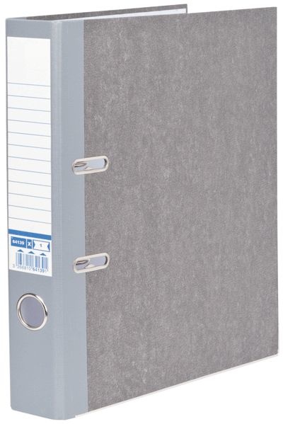 Classeur à levier en carton gris, pour format A4, dos 5 cm. Plat papier marbré gris, intérieur papier. Dos balacron, garde imprimée, étiquette collée. Oeillet de maintien et de préhension. Coins métalliques et renforts. Dimensions extérieures : L.29 x H.32 cm.