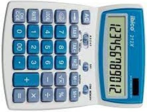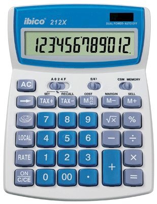 Machine à calculer professionnelle de bureau Ibico 212X. Ecran inclinable, 12 chiffres LCD. Ses atouts : – Fonction prix d”achat/prix de vente/marge – Taxes automatiques +/- – Conversion de devises – Mémoire – Pourcentage – Racine carrée – Correction du dernier chiffre – Arrondi commercial – Double Zéro – Arrêt automatique – Clavier type ordinateur pour une frappe rapide. – Sélection décimale : A 0 2 4 F. – Alimentation solaire et pile fournie. Dimensions : 190 x 140 x 32 mm. Poids : 200 grammes.