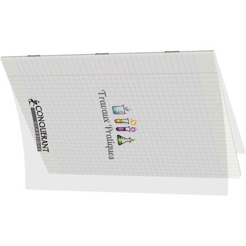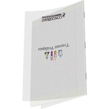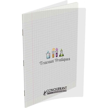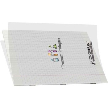 Cahier de travaux pratiques, piqûre 64 pages (32 pages séyès 90g + 32 pages dessin) 17×22 cm. Couverture en polypropylène incolore.