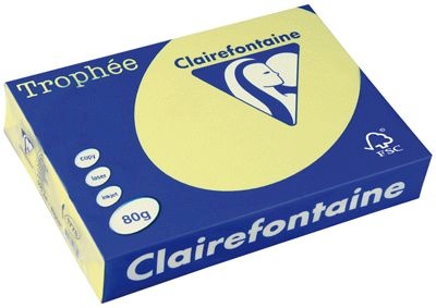 Ramette de 500 feuilles de papier 80g de format A4 jonquille TROPHEE CLAIREFONTAINE. Gr�ce � son excellente opacit�, les impressions recto verso sont parfaites, le rendu fid�le des couleurs est assur�. Sa grande tenue permet un passage impeccable en machine. Son emballage refermable et transparent permet de v�rifier la couleur et le niveau de papier restant dans la ramette. TROPHEE vous offre une qualit� d”impression irr�prochable en copie, jet d”encre ou laser.