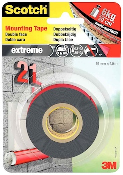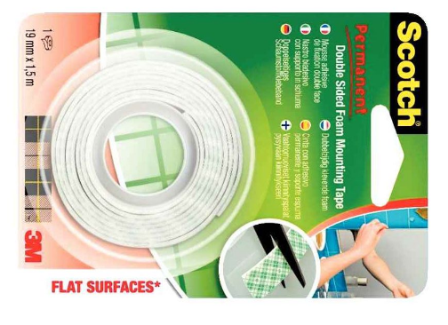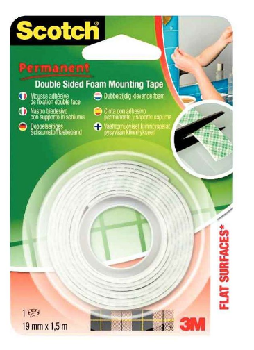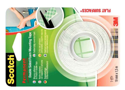 Rouleau de mousse adhésive double face Scotch Moun épaisseur 1,6mm, dimensions 19mm x 1,5m. Pour fixation intérieure. Facile à utiliser pour fixer des objets sur des supports tels que plastique, peinture, bois, verre, céramique…