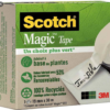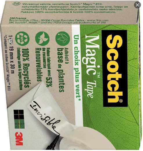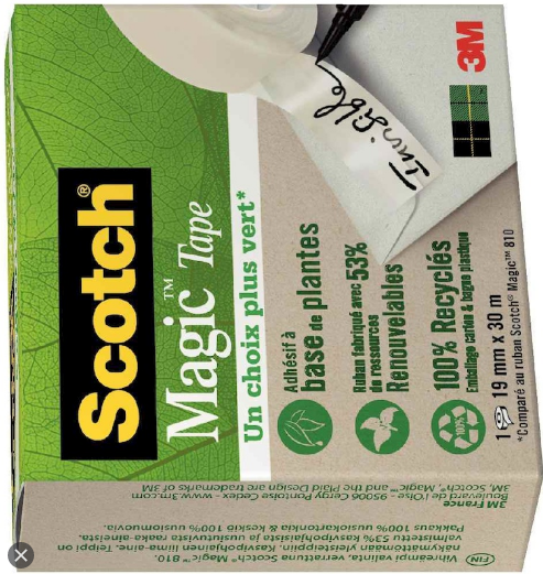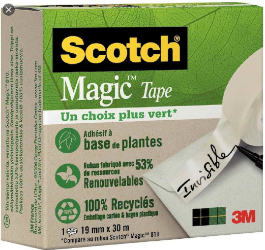 Rouleau adhésif invisible scotch Magic green, dimensions : 19mm x 30m. Ruban complètement invisible après application, il le restera au fil du temps. C”est l”outil idéal pour les finitions soignées ou les travaux professionnels : réparer, sans laisser de traces, des documents déchirés, assembler des feuilles de papier, afficher des notes ou des pense bêtes, faire des montages à photocopier… Ne se déchire pas au déroulement, se déroule en douceur et sans bruit, indétectable à la photocopie. Permet l”écriture, ne jaunit pas. Film fabriqué à partir de matières naturelles. Emballage 100% recyclé. Sans solvant, adhésif à base de plantes. Bague en plastique recyclé.
