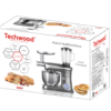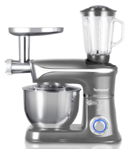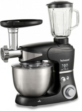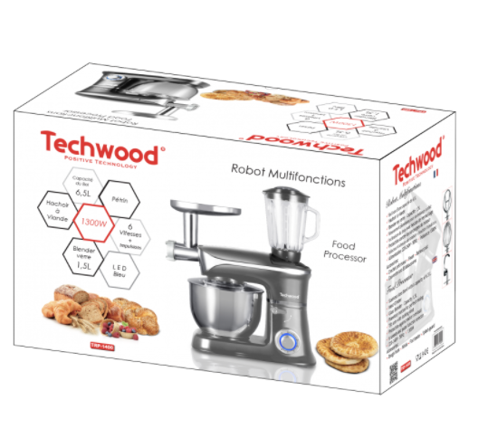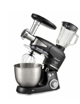 Bol inox d’une capacité de 7L Hachoir à viande / Blender en verre – Capacité 1,5L Mouvement planétaire pour un mélange parfait Inclinaison du bras avec bouton de verrouillage Protection contre les surcharges du moteur Sélecteur 6 vitesses + impulsions avec témoin LED Alimentation 220-240V~ 50Hz P Puissance 1300W Accessoires: Crochet pétrisseur – Fouet – Batteur plat Spatule – Couvercle Anti Eclaboussures