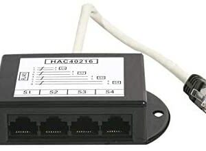 - Permet de raccorder jusqu’à 4 postes téléphoniques avec prises RJ (RJ11 ou RJ45) sur une RJ45 murale.- Composé d’un boîtier plastique noir, avec sorties RJ45 femelles, avec cordon.- Câble 4 paires CAT5e + un connecteur mâle RJ45- Repérage de chaque sortie RJ45 par étiquettes “SI”,”S2″,”S3″,”S4
