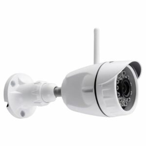 Caméra extérieure étanche Full HD avec éclairage LED et détection de mouvement. Le HWC404 a un boîtier métallique et une vision nocturne. Pour l’extension de la mémoire, une carte micro SD jusqu’à 128 Go peut être placée.