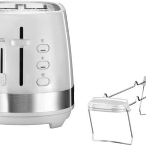 900 W – Grille-pain 2 fentes, 2 tranches – Corps en métal – Fonction prévisualisation – Fonction baguette – Fonction décongélation – Fonction réchauffage – Réchauffe viennoiserie amovible en inox – Contrôle électronique du dorage – Thermostat électronique -Résistance en mica – Tiroir ramasse-miettes en inox – Collection Blanc