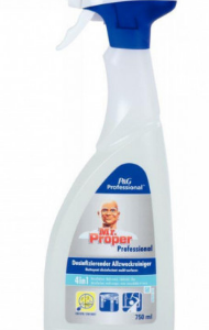 Spray 750ML nettoyant désinfectant multi-surfaces MR PROPRE PROFESSIONNEL. Prêt à l’emploi pour le nettoyage et la désinfection des surfaces, y compris les surfaces vitrées Ne laisse pas de trâces et laisse un parfum frais. Produit non corrosif Bactéricide EN1276, EN 13697 – Fongicide EN 1650 – Sporicide EN 13704 – Virucide EN 14476