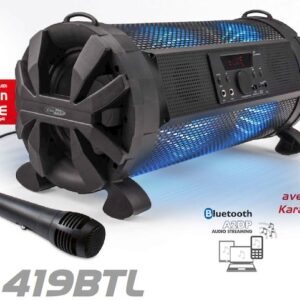 Option Karaoke Sing-Along – Bluetooth 4.2 avec 10 mètres de portée – Permet de lire des fichiers USB – Les voyants LED multicolores peuvent s’allumer en différents modes – Batterie intégrée avec 8 heure d’autonomie – Micro inclus pour le karaoke – Prise d’entrée audio 6,3 mm intégrée