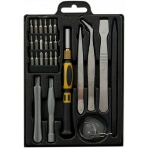 L’indispensable pour tout réparateur de smartphones et Mac Book!| |- 18 embouts| – SL1.5, SL2.0, SL2.5| – PH000, PH00, PH0, PH1| – Torx: T4, T5, T6, T8, T10| – HEX 1.5, HEX 2.0| – Pentalobe: 0.8, 1.2, 1.5| – Tri-Lobe #0| |- Tournevis à manche rotatif pour faciliter le vissage & dévissage|- Grattoir pour soudure|- 2 outils à ouverture|- Ventouse pour écran|