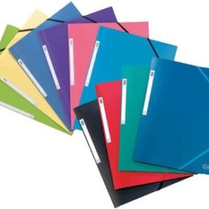 Paquet de 10 chemises 3 rabats à élastiques MEMPHIS en polypropylène opaque 5/10ème, coloris assortis. Coloris assortis : bleu, noir, rouge, vert, rose, bleu turquoise, bleu lavande, vert anis et jaune maïs. Qualité très résistante. Grain structuré. Toucher satiné, anti trace. Dos plat, capacité 150 feuilles. Étiquette de dos. Format 24×32 cm pour format A4 à classer.