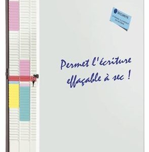 Planning portefeuilles à fiches indice 2 format 134×101. 2 plannings à fiches et un tableau blanc réunis en un seul produit. Entièrement métal et se fermant à clef pour une parfaite confidentialité. Face extérieure tableau blanc en tole laquée format 67×101 cm. Deux faces intérieures pour bandes planning 54 fentes. (livré avec 20 bandes indice 2 gris clair + 1000 fiches indice 2 : blanc, rouge, jaune, vert, bleu, rose, orange, gris, beige et violet). Capacité 1080 fiches indice 2. Set de fixation mural fourni.