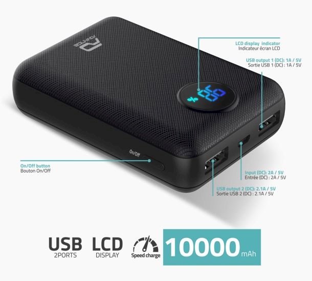 - Intensité de sortie de 2,4 A (via les 2 ports USB-A) pour un rechargement rapide de vos appareils; intensité d’entrée de 2 A (via le port micro-USB et en utilisant le câble de 15 cm de long inclus)