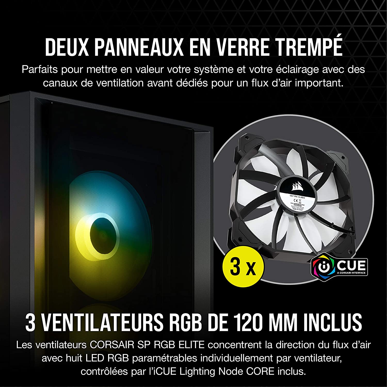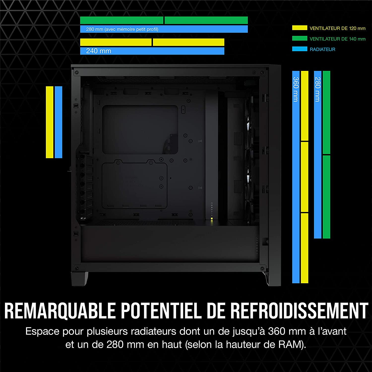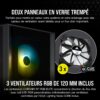 Trois ventilateurs RGB de 120 mm inclus : les ventilateurs Corsair AirGuide RGB sont dotés de pales antivortex qui concentrent le flux d’air et optimisent le refroidissement.