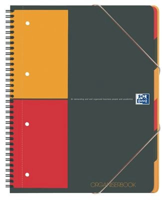 ORGANISER BOOK, cahier trieur à reliure intégrale 180 pages, feuilles A4 perforées détachables 80g, quadrillées 5×5, format 24.5×31 cm, avec 3 rabats et un trieur 6 touches . Fermeture par élastique.