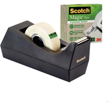 Pack dévidoir C38 NOIR en plastique recyclé + 3 rouleaux d adhésifs invisibles Scotch Magic Green.