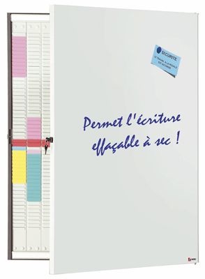 Planning portefeuilles à fiches indice 2 format 134×101. 2 plannings à fiches et un tableau blanc réunis en un seul produit. Entièrement métal et se fermant à clef pour une parfaite confidentialité. Face extérieure tableau blanc en tole laquée format 67×101 cm. Deux faces intérieures pour bandes planning 54 fentes. (livré avec 20 bandes indice 2 gris clair + 1000 fiches indice 2 : blanc, rouge, jaune, vert, bleu, rose, orange, gris, beige et violet). Capacité 1080 fiches indice 2. Set de fixation mural fourni.