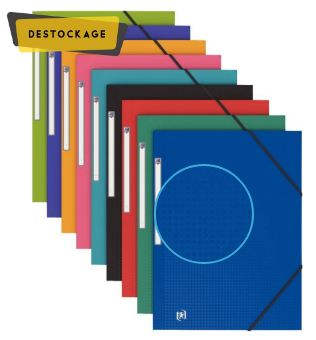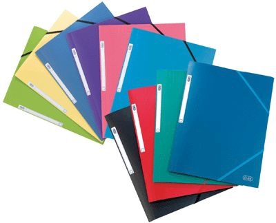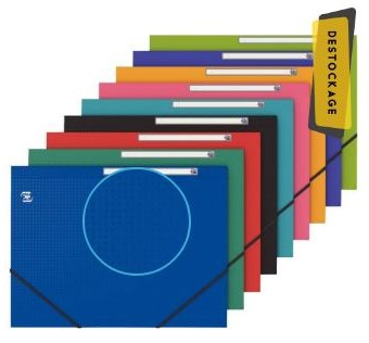 Paquet de 10 chemises 3 rabats à élastiques MEMPHIS en polypropylène opaque 5/10ème, coloris assortis. Coloris assortis : bleu, noir, rouge, vert, rose, bleu turquoise, bleu lavande, vert anis et jaune maïs. Qualité très résistante. Grain structuré. Toucher satiné, anti trace. Dos plat, capacité 150 feuilles. Étiquette de dos. Format 24×32 cm pour format A4 à classer.