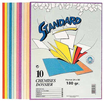 Paquet de 10 chemises dossier 180 g. Assortis : Bleu vif, vert, rose, lilas, gris, rouge, orange.
