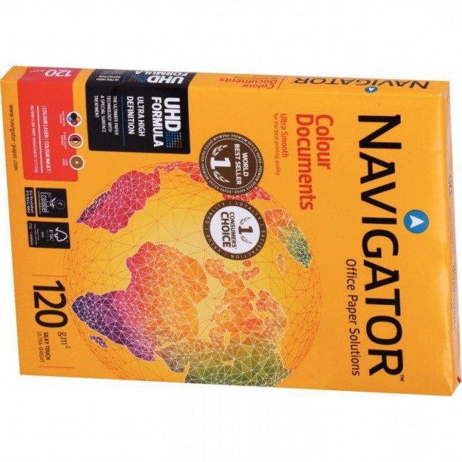 Paquet de 250 feuilles de papier blanc 120g de format A4 NAVIGATOR. Le Papier reprographique NAVIGATOR offre des performances incomparables, grande stabilité de feuille, pour un bon rapport qualité prix. – Blancheur éclatante, indice de blancheur CIE : 169 – Très bonne opacité, – Très bon passage machine, – Garanti pour imprimantes laser et jet d”encre et copieur grande vitesse. Ce papier valorise la communication de votre entreprise. Formule UHD : Navigator améliore son état de surface pour une absorption dencre optimisée, qui offre un résultat dimpression unique et révolutionnaire. Avec Navigator UHD, vous gagnerez jusquà 40% en qualité de résolution*. *Mesure en valeur absolue de létendue du gamut de couleurs en impression jet dencre.