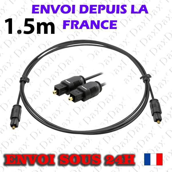 CABLE AUDIO FIBRE OPTIQUE NUMERIQUE TOSLINK Longueur: 1,5m Ce câble est utilisé pour les liaisons audio numériques optiques, lecteurs CD, lecteurs DVD, Blu ray, décodeurs TV numérique. Compatible avec XBOX 360, PS3, HDTV, Cablebox, Matériel DVD Blu ray, amplificateur sonore ect etc Raccords Toslink (Plug de forme carrés) Fournis avec une protection en plastique à enlever avant utilisation. Haute qualité