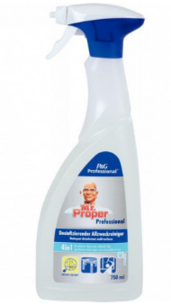 Spray 750ML nettoyant désinfectant multi-surfaces MR PROPRE PROFESSIONNEL. Prêt à l’emploi pour le nettoyage et la désinfection des surfaces, y compris les surfaces vitrées Ne laisse pas de trâces et laisse un parfum frais. Produit non corrosif Bactéricide EN1276, EN 13697 – Fongicide EN 1650 – Sporicide EN 13704 – Virucide EN 14476
