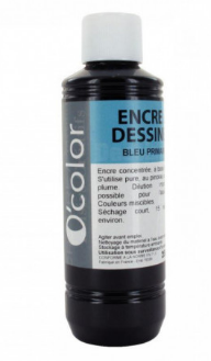 Flacon de 250 ml d’encre à dessiner coloris bleu. Encre concentrée fluide à séchage rapide, à base d’eau sans solvant, diluable à l’eau.Fixation directe sans obligations de vernir.Couleurs transparentes, éclatantes, superposables, miscibles entre elles.Prête à l’emploi et idéale pour combinaisons avec pastels gras, décoration au gros sel, à l’eau de javel, avec de la colle vinylique…Réalisation d’aplats sans trace de pinceau.Toutes techniques artistiques: soufflage, projection, tamponnage, aquarelle…Support: surtout papier ou carton, également bois.Utilisations à la plume ou au pinceau.Nettoyage : Nettoyer le matériel et les tâches à l’eau froide avant séchage.Ne contient ni lait de vache, ni blé, ni oeuf, ni arachide.