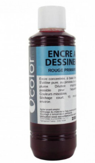 Flacon de 250 ml d’encre à dessiner coloris rouge. Encre concentrée fluide à séchage rapide, à base d’eau sans solvant, diluable à l’eau.Fixation directe sans obligations de vernir.Couleurs transparentes, éclatantes, superposables, miscibles entre elles.Prête à l’emploi et idéale pour combinaisons avec pastels gras, décoration au gros sel, à l’eau de javel, avec de la colle vinylique…Réalisation d’aplats sans trace de pinceau.Toutes techniques artistiques: soufflage, projection, tamponnage, aquarelle…Support: surtout papier ou carton, également bois.Utilisations à la plume ou au pinceau.Nettoyage : Nettoyer le matériel et les tâches à l’eau froide avant séchage.Ne contient ni lait de vache, ni blé, ni oeuf, ni arachide.
