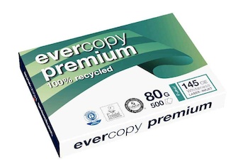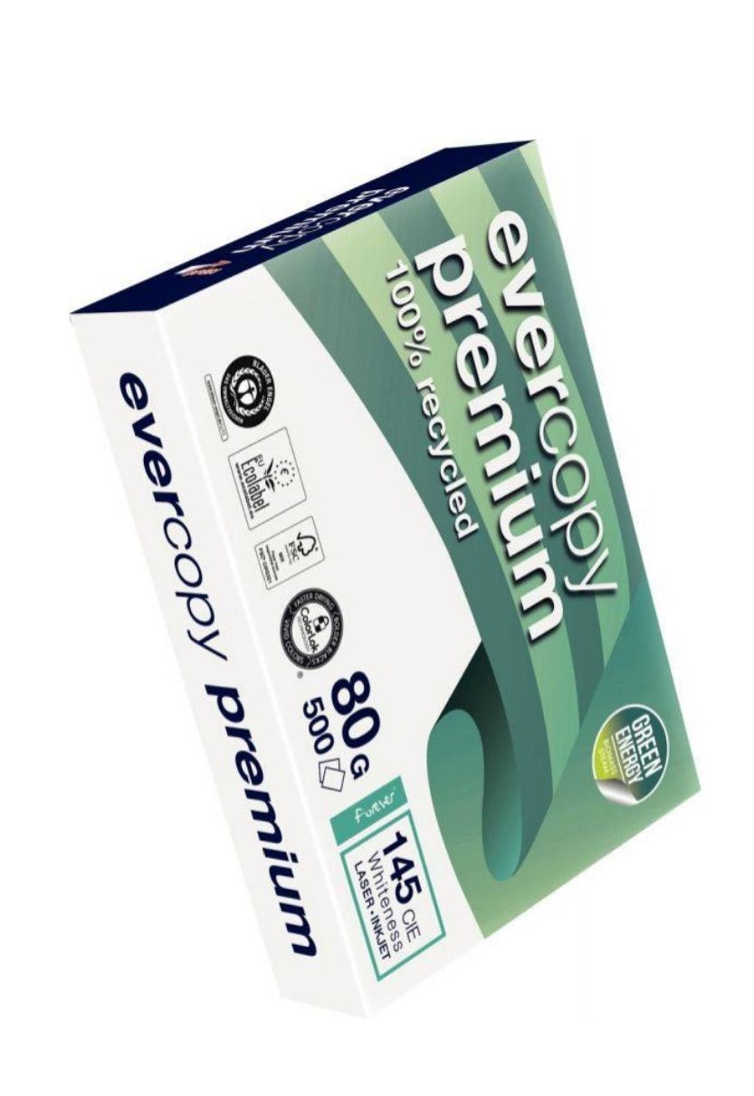 Ramette 500 feuilles A3 80g EVERCOPY PREMIUM. Papier de bonne blancheur, à légal des papiers standards. Indice de blancheur = 145. Papier 100% recyclé. A base de 100% de vieux papiers non désencrés. Son principe de fabrication unique permet avec 106kg de vieux papiers de produire 100kg de papier ramettes sans désencrage ni utilisation dazurant optique. Qualité dimpression et passage machine en tous points semblables aux papiers fibres vierges. Certifié , FSC, Ange bleu, Eco label, DIN 6738 et Colorlok. Fabriqué en France.