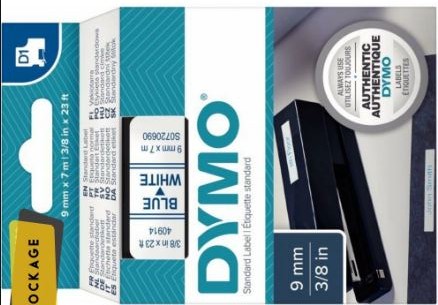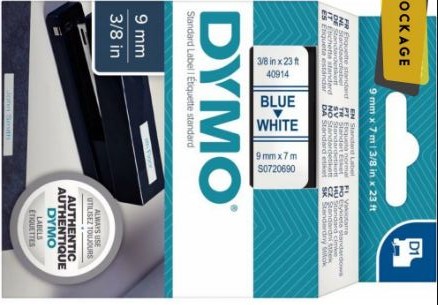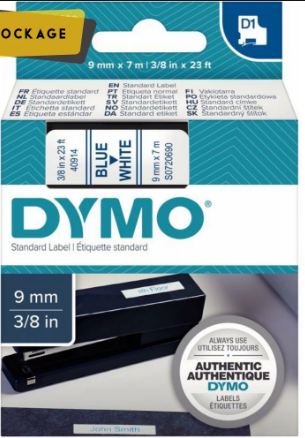 Ruban cassette 9 mm x 7 m impression bleu support blanc. Système D1 a mono-cassette pour modèles : 1000 / 1000+ / 2000 / 3500 / 4500 / 5500 / LP 100 / LP 200 / LP 300 / LM 100 / LM100+ / LM 150 / LM 200 / LM300 / LM 350 / LM400 / LM PC / Pocket.Ruban encreur et ruban support associés offrent une totale facilité d”utilisation du système. Support plastique. Les étiquettes imprimées s”utilisent toutes de la même façon. Elles adhèrent sur la plupart des surface propres et planes ( papier, plastique, métal, bois, verre ).Résistantes à l”eau, au pétrole et aux graisses de même qu”à la plupart des solvant doux.Elles résistent également aux températures situées entre – 30° et + 150°C.