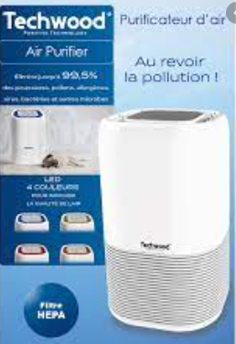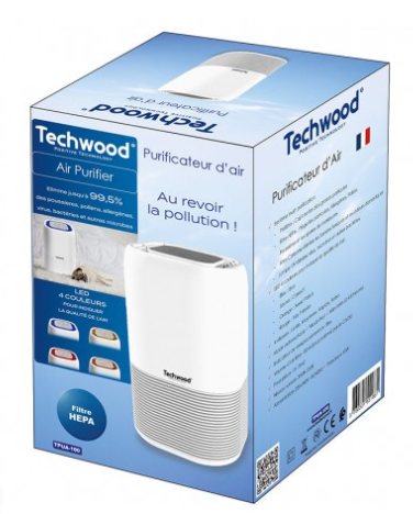 Purificateur d’air TECHWOOD – Puissance: 45W -Alimentation: 220-240V~50/60Hz – Niveau sonore : 30dB-55dB – Système multi purification-Préfiltre : Capture les plus grosses particules – Filtre HEPA : Piège les particules, Allergènes, Pollen – Poussières et les spores de moisissures – Filtre Carbone élimine les fumées toxiques et les odeurs domestiques – Lampe UV élimine virus, microbes et autres bactéries – LED 4 couleurs pour indiquer la qualité de l’air – 4 vitesses – Mode automatique – Mode Nuit – Indicateur de remplacement du filtre – Volume d’air filtré 100 m3/h (confirmé par le CADR)