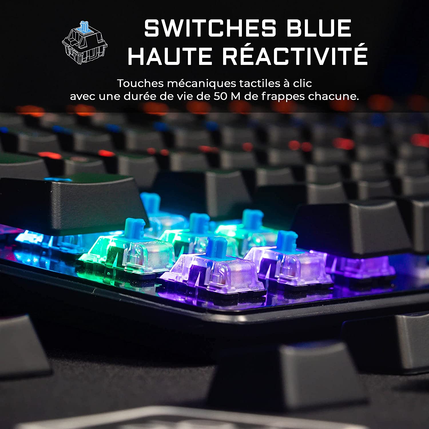 FRAPPE EXCEPTIONNELLE. Le clavier mécanique Keyz Carbon V3 est équipé de Switchs Blue ultras réactifs avec un temps de réponse d’1 milliseconde seulement. Avec ses commutateurs bleus, les plus populaires du marché, ce clavier vous assure une frappe plus rapide et plus précise. Vous verrez très vite que vous gagnez en vitesse de frappe. Les touches de ce clavier offrent un retour tactile et un son de clic. Si vous aimez entendre le bruit de vos touches, vous allez adorer le Keyz Carbon V3 !
