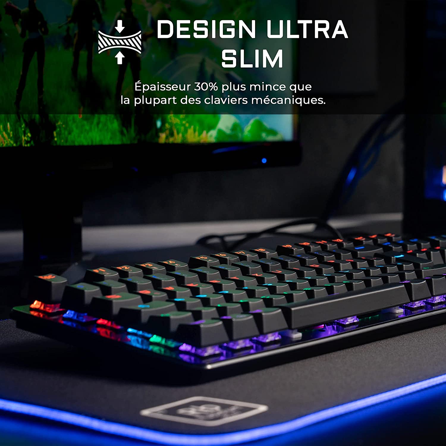 DESIGN ERGONOMIQUE + SIMPLE À UTILISER. En plus de sa frappe très agréable au toucher, le Keyz Carbon V3 propose des finitions soignées et un design ultra mince. Facile à prendre en main, vous verrez tout de suite la différence avec un clavier membrane classique. Branchez-le et il fonctionne instantanément sans le moindre driver à installer au préalable. Ce clavier mécanique gamer est compatible sur PC, PS4, PS5, Xbox One et Xbox Series X et convient à tous les types de jeux : FPS, MOBA, RPG