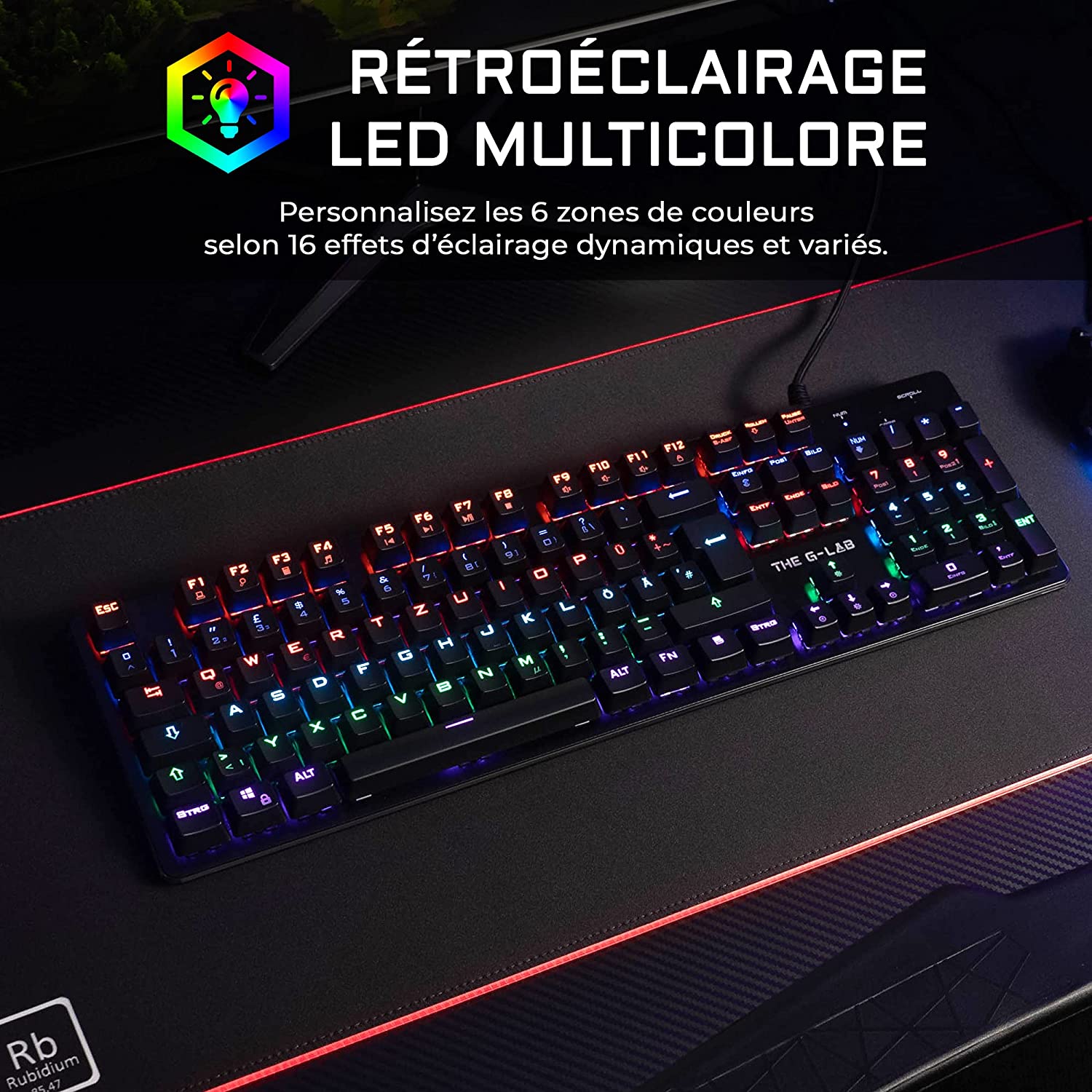 RÉTROÉCLAIRAGE MULTICOLORE. Avec son rétroéclairage multicolore très lumineux, le Keyz Carbon V3 resplendira sur votre bureau ! Profitez de 16 effets de rétro-éclairage différents : 8 modes prédéfinis ainsi que 8 gaming modes. Ce clavier mécanique gamer vous donne même la possibilité de choisir la vitesse et l’intensité lumineuse des effets. Pas de logiciel superflus à installer, tout se règle directement sur le clavier Keyz Carbon V3 en toute simplicité grâce à des combinaisons de touches.