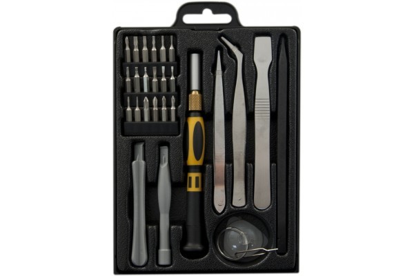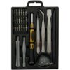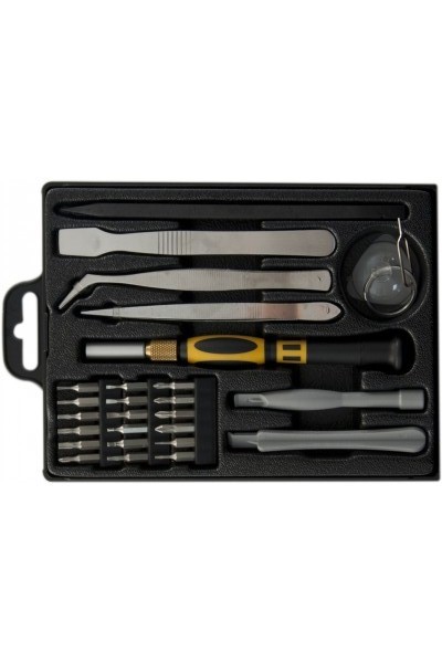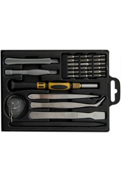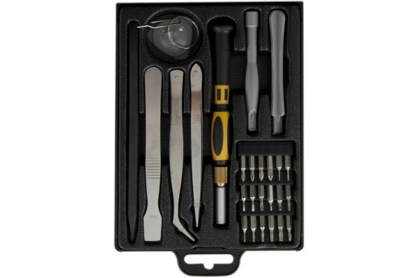 L’indispensable pour tout réparateur de smartphones et Mac Book!| |- 18 embouts| – SL1.5, SL2.0, SL2.5| – PH000, PH00, PH0, PH1| – Torx: T4, T5, T6, T8, T10| – HEX 1.5, HEX 2.0| – Pentalobe: 0.8, 1.2, 1.5| – Tri-Lobe #0| |- Tournevis à manche rotatif pour faciliter le vissage & dévissage|- Grattoir pour soudure|- 2 outils à ouverture|- Ventouse pour écran|