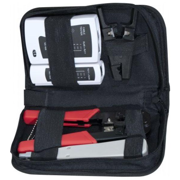 Trousse réseau – 1 Outil de raccordement KRONE IDC – 1 Dénudeur de câbles – 1 Pince à sertir RJ-12 et RJ-45 – 1 Testeur réseau