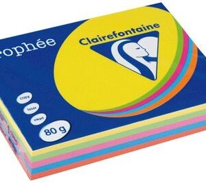 Rame de 500 feuilles de papier 80g de format A3 assortis intense TROPHEE CLAIREFONTAINE. Grâce à son excellente opacité, les impressions recto verso sont parfaites, le rendu fidèle des couleurs est assuré. Sa grande tenue permet un passage impeccable en machine. Son emballage refermable et transparent permet de vérifier la couleur et le niveau de papier restant dans la ramette. TROPHEE vous offre une qualité d”impression irréprochable en copie, jet d”encre ou laser. Sa structure homogène garantit un passage en copieur sans bourrage. Coloris : soleil, menthe, cardinal, turquoise et fuchsia.