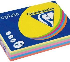 Ramette de 500 feuilles de papier 80g de format A4 assortis intense TROPHEE CLAIREFONTAINE. Grâce à son excellente opacité, les impressions recto verso sont parfaites, le rendu fidèle des couleurs est assuré. Sa grande tenue permet un passage impeccable en machine. Son emballage refermable et transparent permet de vérifier la couleur et le niveau de papier restant dans la ramette. TROPHEE vous offre une qualité d”impression irréprochable en copie, jet d”encre ou laser. Sa structure homogène garantit un passage en copieur sans bourrage. Coloris : soleil, menthe, cardinal, turquoise et fuchsia.